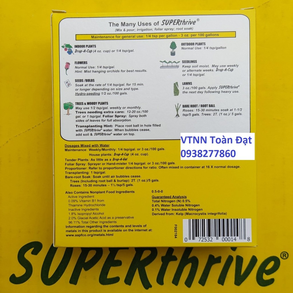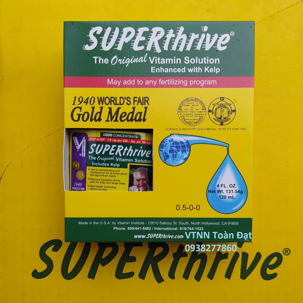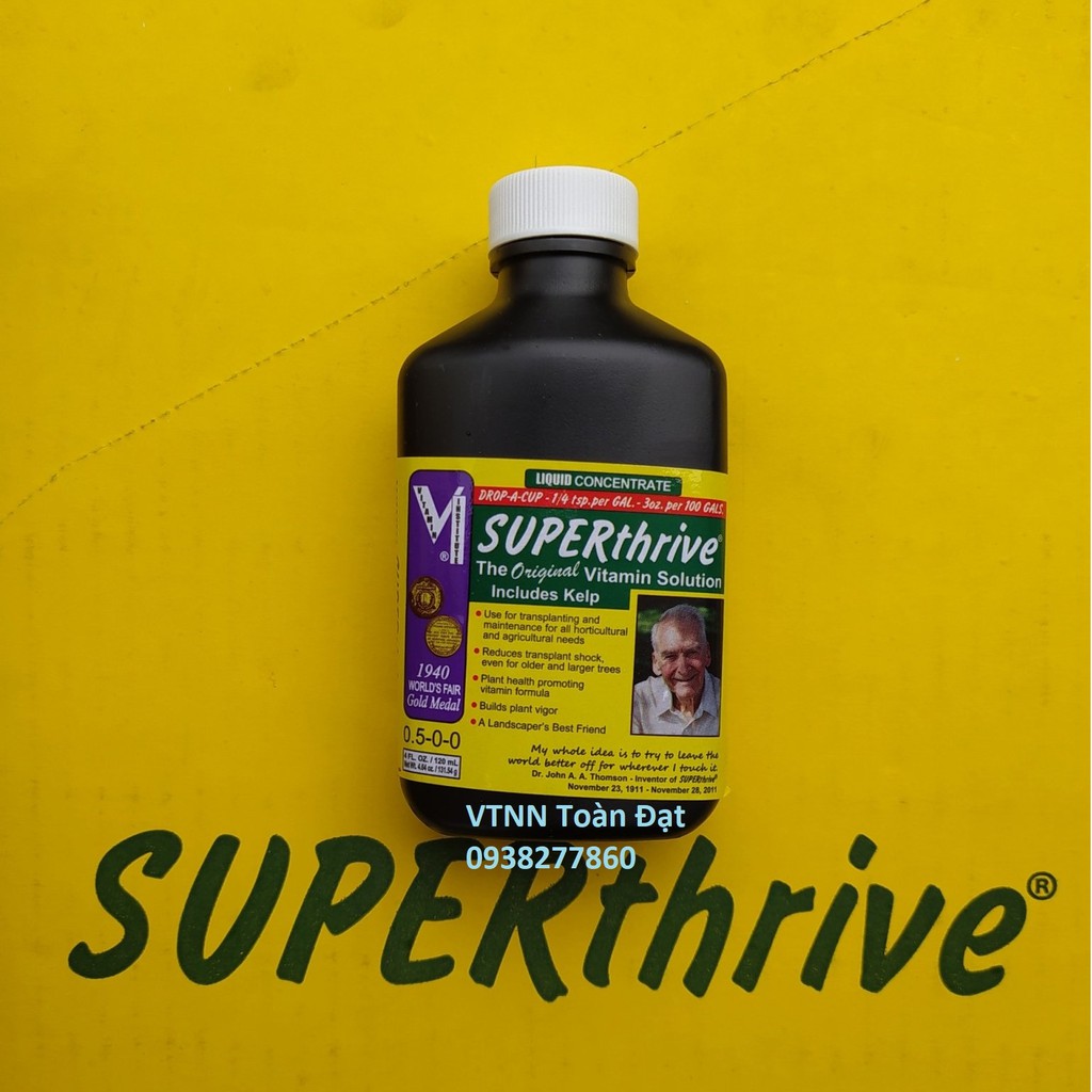 SUPERthrive được một phòng thí nghiệm thử nghiệm của Mỹ (WARF) xác nhận chất lỏng không độc hại – chủ yếu sản phẩm tăng cường sự tăng trưởng cho các thực vật, – được sản xuất từ năm 1940. Nó chứa 0,09% vitamin B 1 , 0,048% 1-Napthyl acetic acid”.