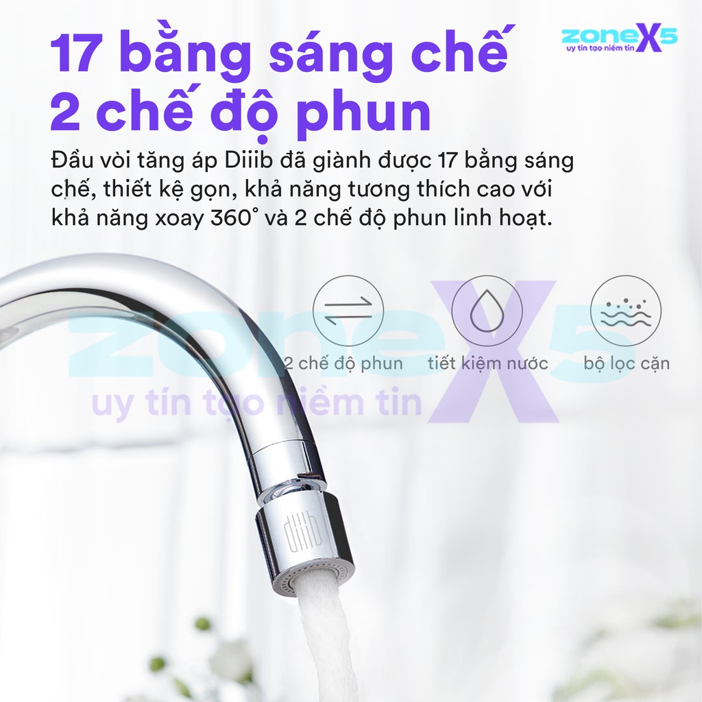 Đầu vòi tăng áp DiiiB DXSZ001-1 đã giành được 17 bằng sáng chế quốc gia, với thiết kế nhỏ gọn, khả năng tương thích cao, tích hợp điều hướng 360 độ và 2 chế độ phun linh hoạt chuyển đổi hứa hẹn sẽ đem lại trải nghiệm tuyệt vời cho người dùng.