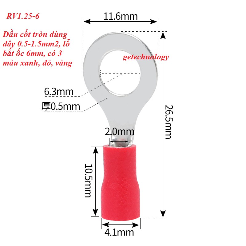 RV1.25-6 Đầu cốt tròn tiết diện dây 0.5-1.5mm2, lỗ bắt ốc 6mm (100 cái/túi)
