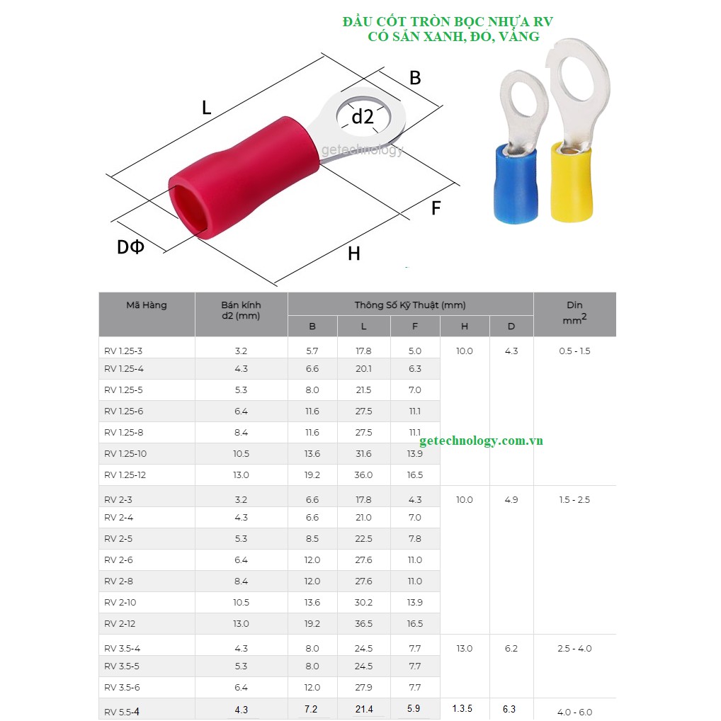 Giới thiệu 100 chiếc Đầu cos/ cốt tròn bọc nhựa RV1.25-4S/5S/6/8 và RV2-4S/5S/6 R3.5-5 R5.5-4