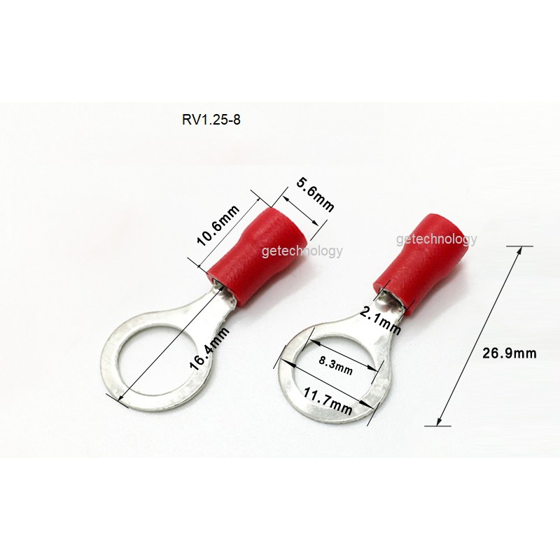 RV1.25-8 Đầu cốt tròn tiết diện dây 0.5-1.5mm2, lỗ bắt ốc 8mm (100 cái/túi)