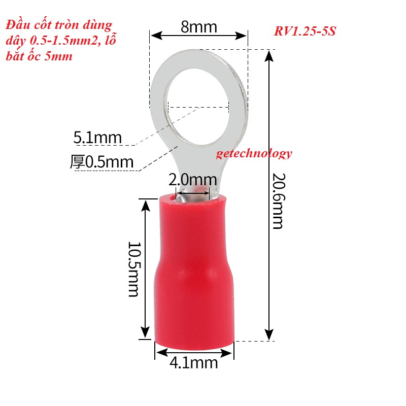 RV1.25-5S Đầu cốt tròn tiết diện dây 0.5-1.5mm2, lỗ bắt ốc 5mm (100 cái/túi)
