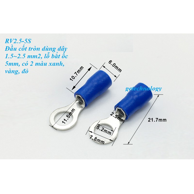 RV2-5S Đầu cốt tròn tiết diện dây 1.5~2.5 mm2, lỗ bắt ốc 5mm (100 cái/túi)