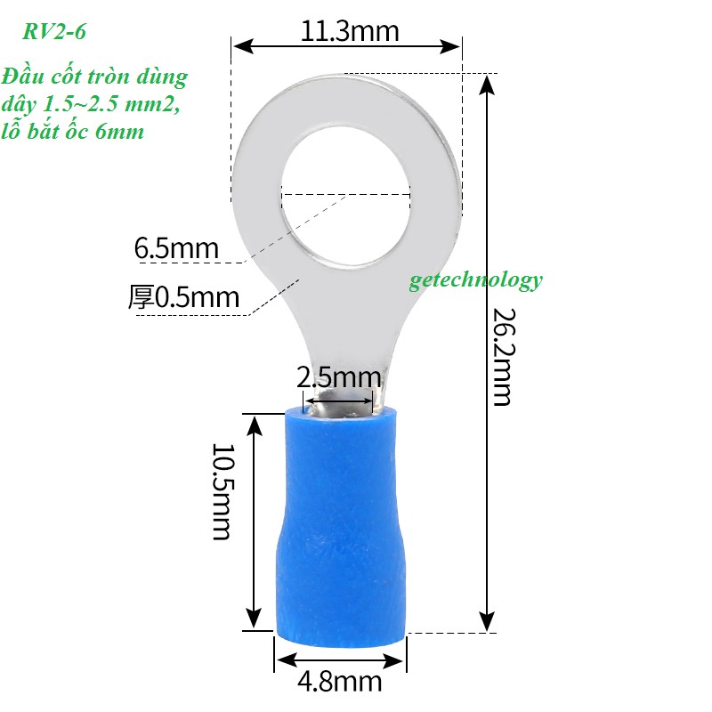 RV2-6 Đầu cốt tròn tiết diện dây 1.5~2.5 mm2, lỗ bắt ốc 6mm (100 cái/túi)