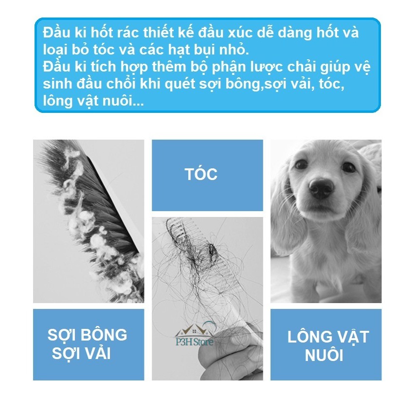 - Với đầu ki hốt rác thiết kế đầu xúc dễ dàng hốt và loại bỏ tóc và các hạt bụi nhỏ