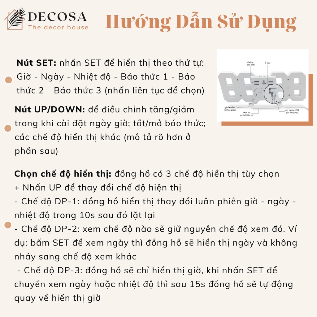 1/ Cài đặt Thời Gian: Khi đồng hồ đang hiển thị giờ: nhấn và giữ nút SET để vào cài đặt giờ, đầu tiên chọn chế độ hiển thị 12/24h (nhấn UP để thay đổi) -> nhấn SET để cài đặt giờ (tăng giảm bằng nút UP/DOWN) -> nhấn tiếp SET để vào cài đặt phút -> nhấn SET để kết thúc