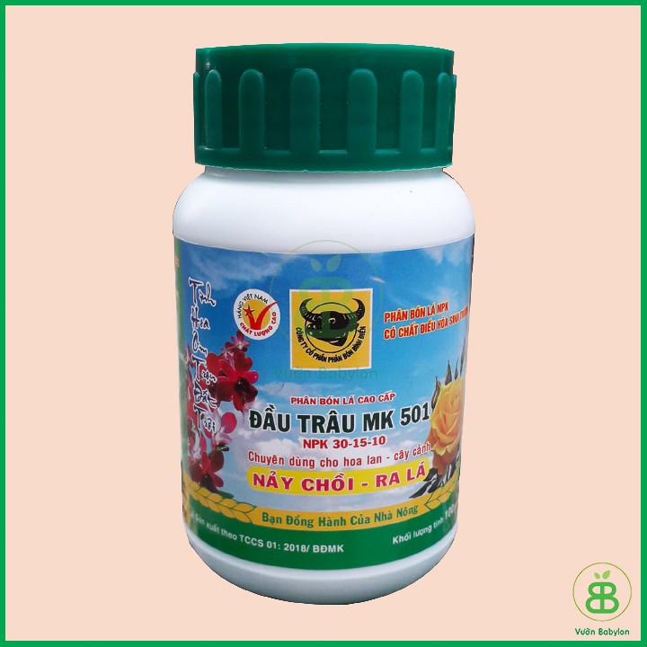 Phân bón đầu trâu 501 phân bón lá phun trực tiếp vào lá và thân cây cung cấp cho cây trồng đạm, khoáng chất giúp hoa lan cây cảnh đâm chồi, nảy lộc nhanh và dễ dàng ra lá. Đâu là một dạng phân NPK tổng hợp cứ trong 100gr có 30gr N, 15gr lân và 10gr kali. Với hàm lượng đạm cao giúp cây trồng ra nhiều lá và quả hơn.