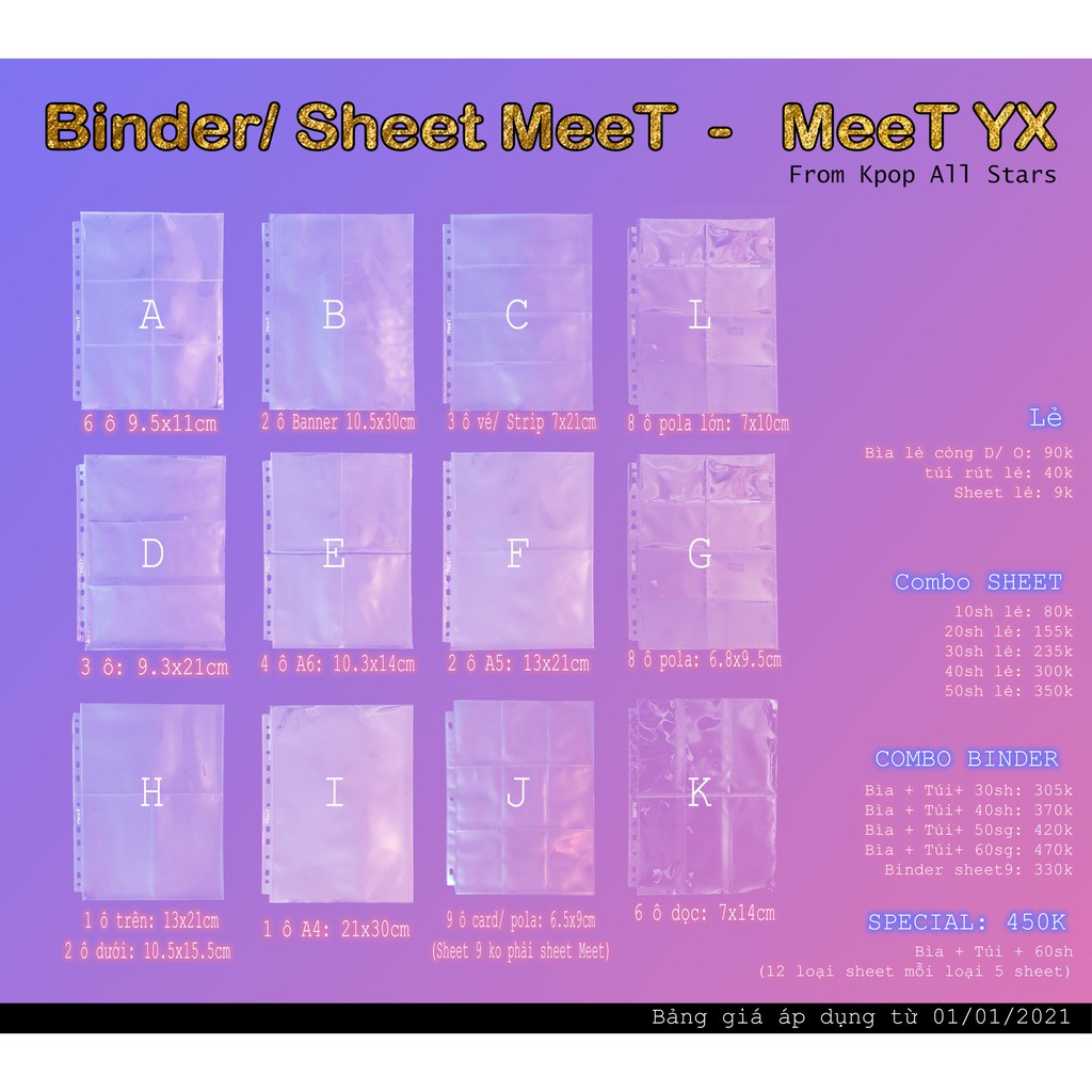+ sheet 9 2 mặt: 9 ô đựng card/pola dọc: kích thước 6.5x9cm (không phải sheet Meet) - Sheet 2 mặt đựng 18 card