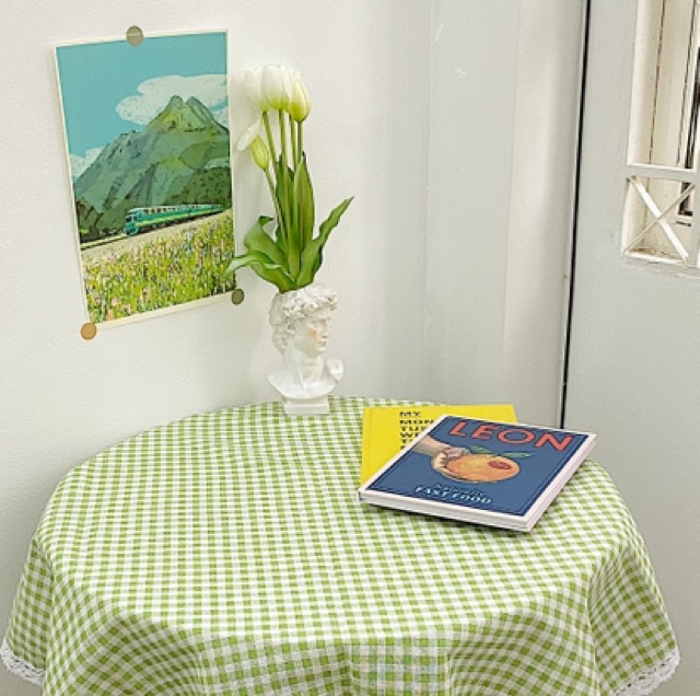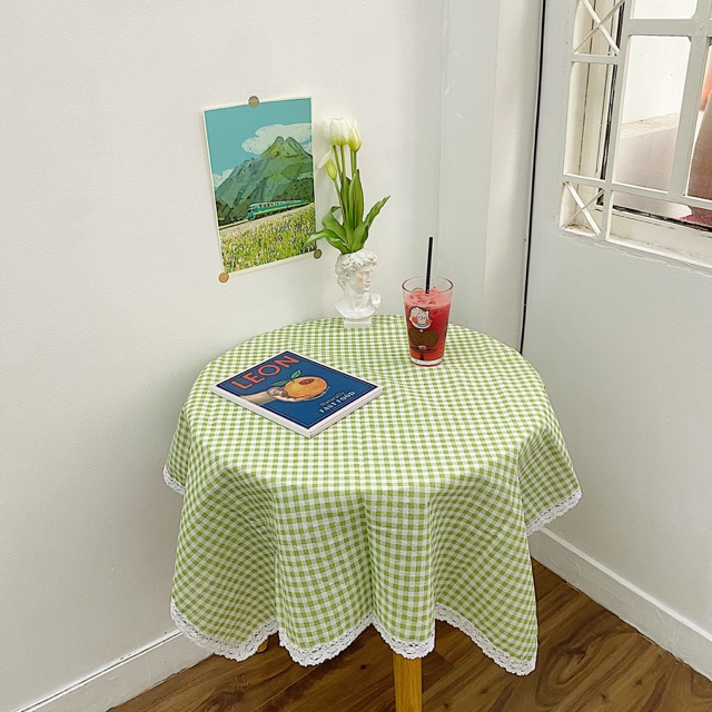 Khăn trải bàn caro xanh viền ren trắng 🍏 cực xinh. Có bạn nào thích tông xanh lá 🍃 này không ? Trải bàn lên dán tấm postcard cùng tông màu là có một khu chill chill rồi 🎨Size : 90x150cm. Mn nhớ đo bàn nha 🌷