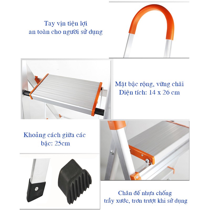 🔧 Loại 4 bậc- chiều cao bậc trên cùng 0.9m - kt thu gọn 1.44 x 0.54 x 0.06m - trọng lượng 5 kg - tải trọng 150 kg