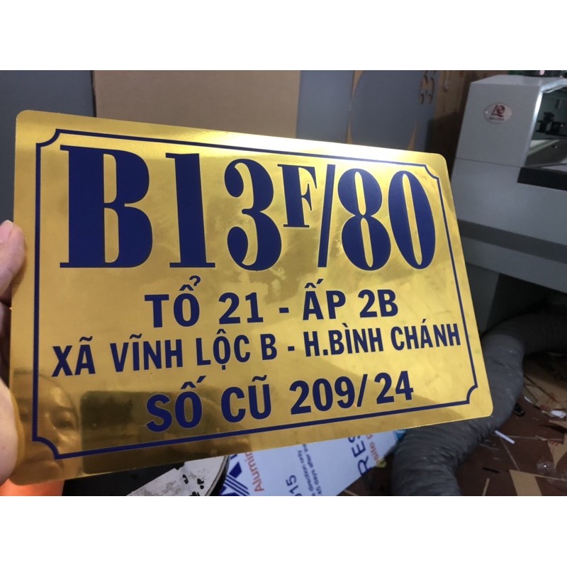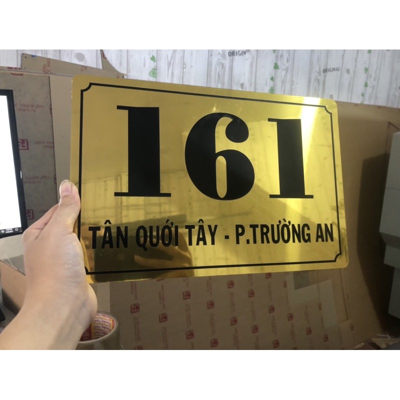 Bảng số nhà, bảng công ty chất liệu bằng alu gương vàng, alu xước sáng bóng đẹp,làm nhanh lấy liền kt 30*20cm.Bảng làm bằng chất liệu cao cấp, số và địa chỉ gắn chìm, bảng gắn ngoài trời đảm bảo độ bền.