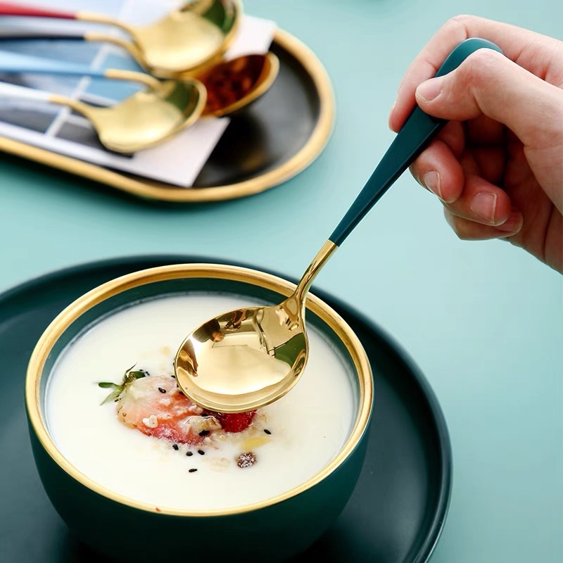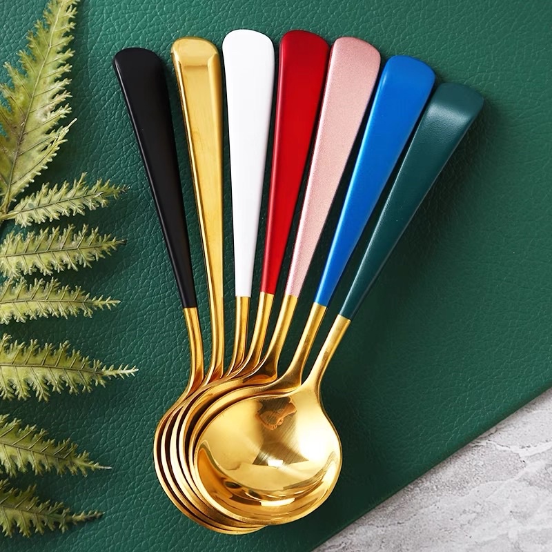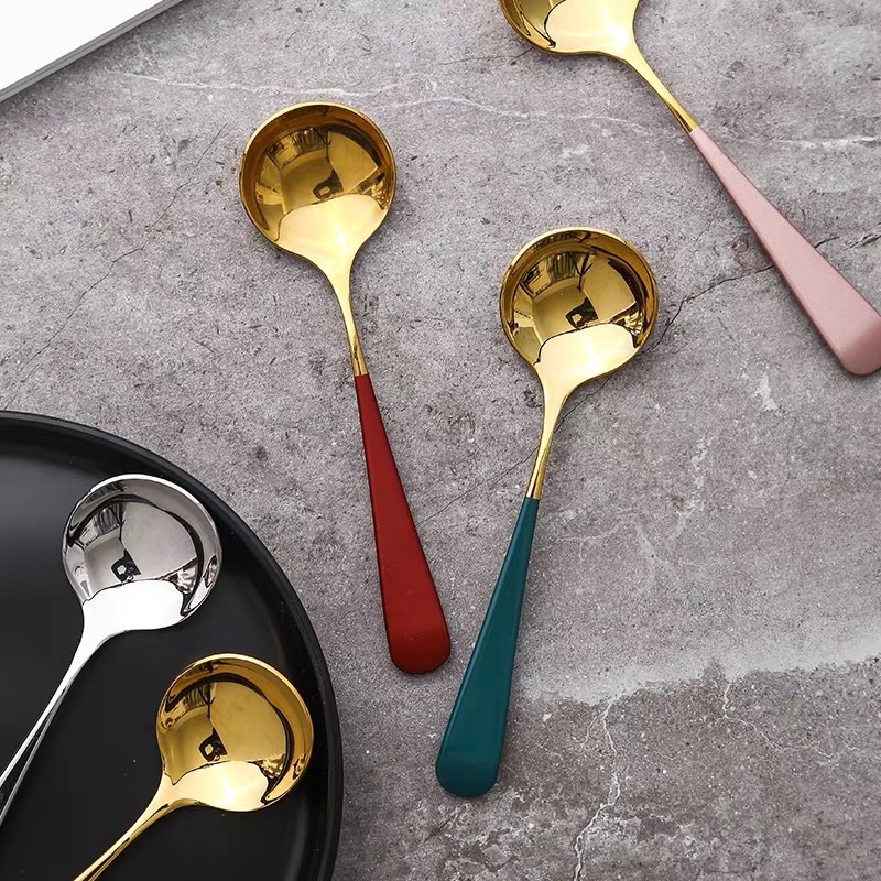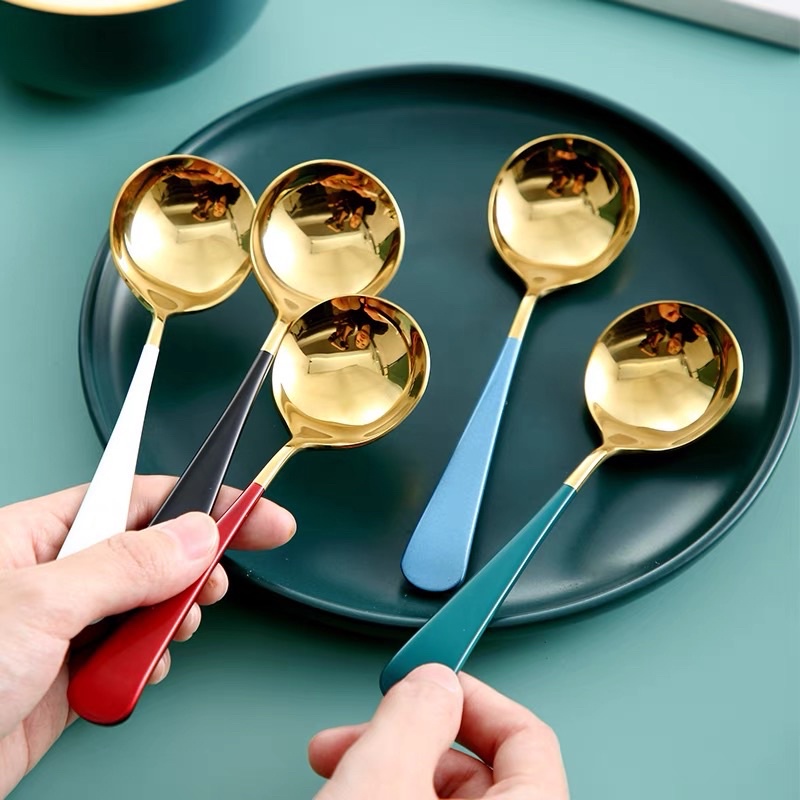 ✔️ Thìa Inox Mạ Vàng Cán Dài Nhiều Màu Với thiết kế tròn, rộng phù hợp khuôn miệng, dễ dàng xúc cơm, soup, cháo...