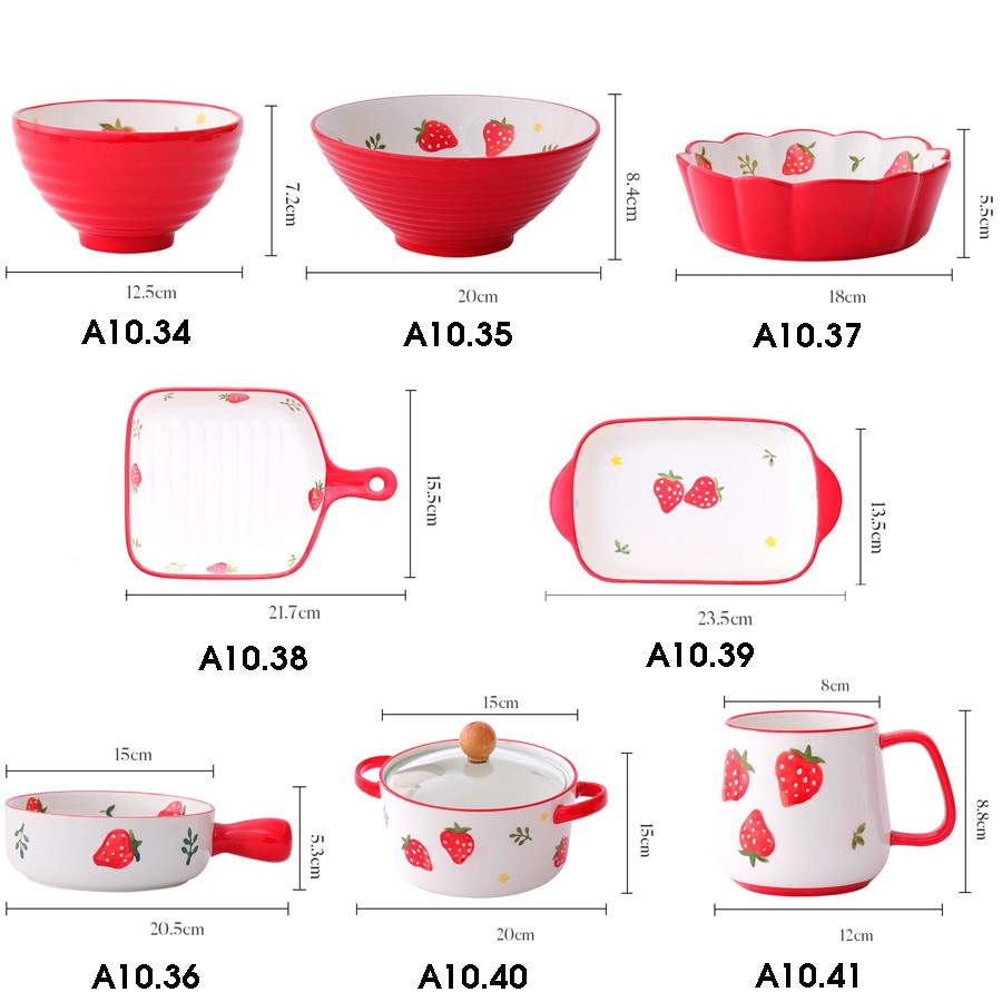 + Bộ sưu tập bát đĩa sứ dâu tây viền đỏ gồm 8 món.
