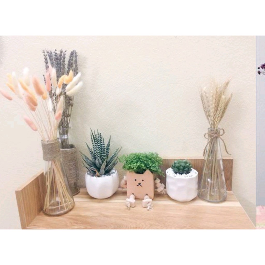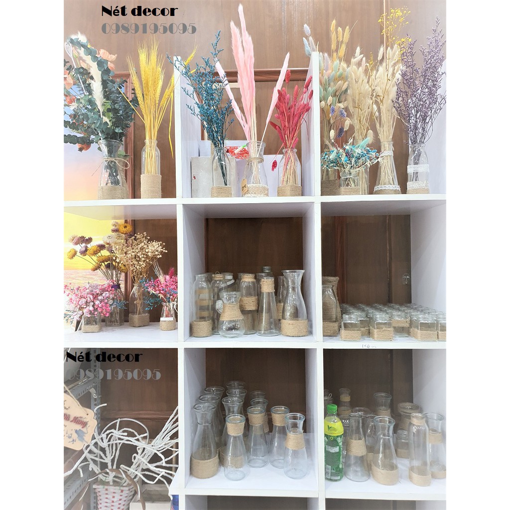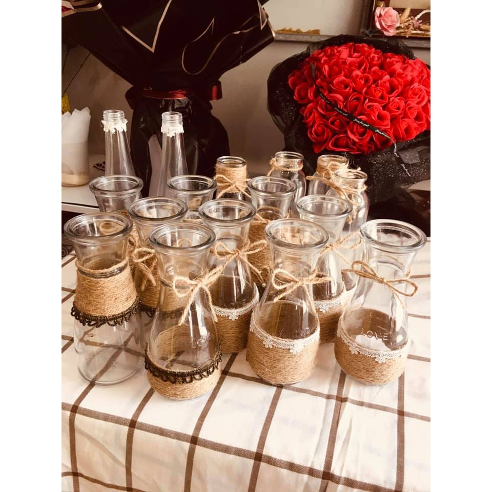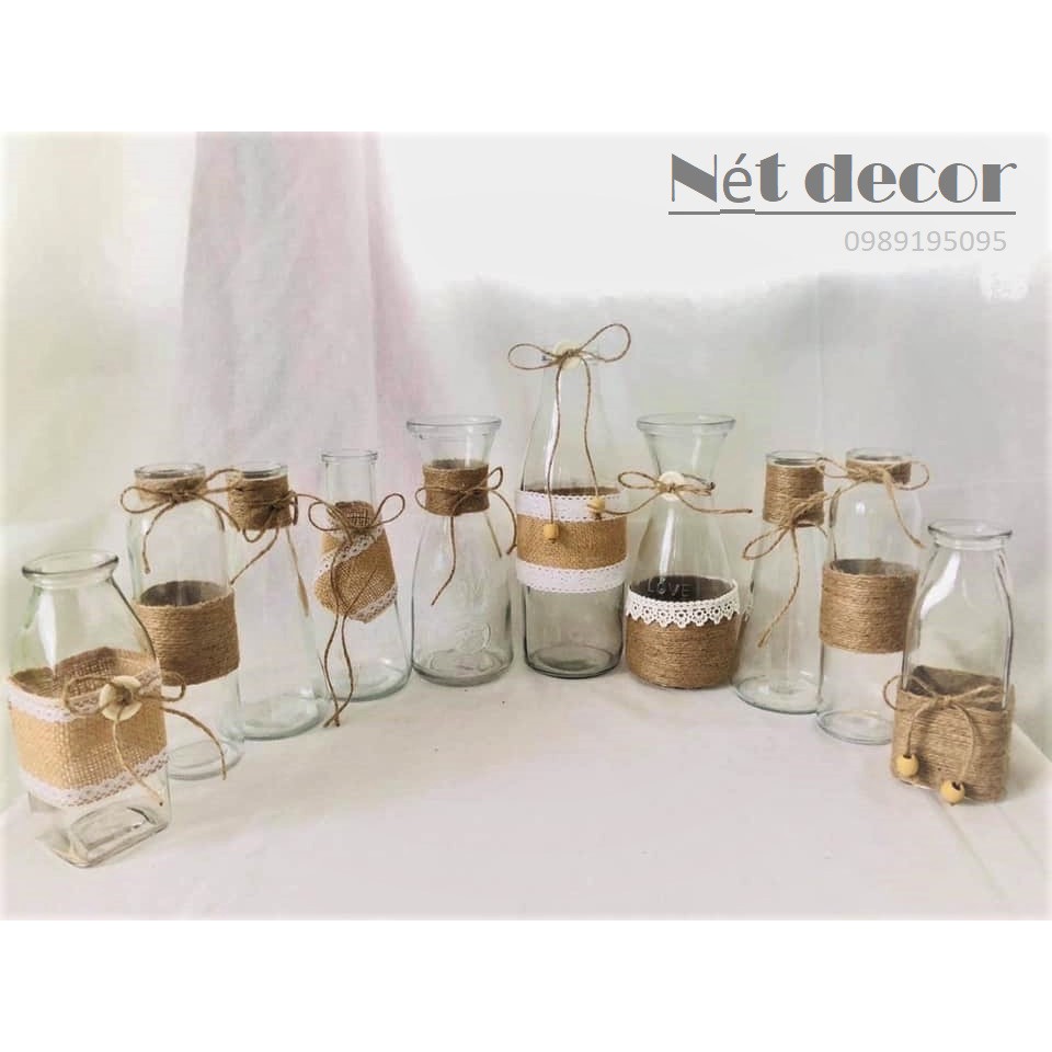 Lọ hoa shop trang trí bằng dây thừng , dây cói , ren , ruy băng, cúc gỗ , thẻ tag .... nhiều kiểu . khách chat với shop để chọn kiểu mình thích , nếu ko có yêu cầu shop sẽ giao mẫu ngẫu nhiên ạ ,