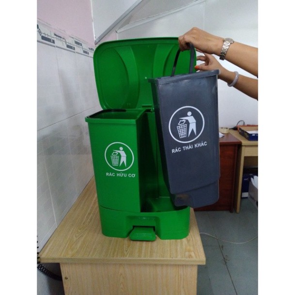 Có 2 ngăn tiện lợi khi bạn phân loại rác hữu cơ và vô cơ. Thiết kế thông minh đạp chân nắp bật giúp bạn bỏ rác mà không cần dùng tay mở nắp