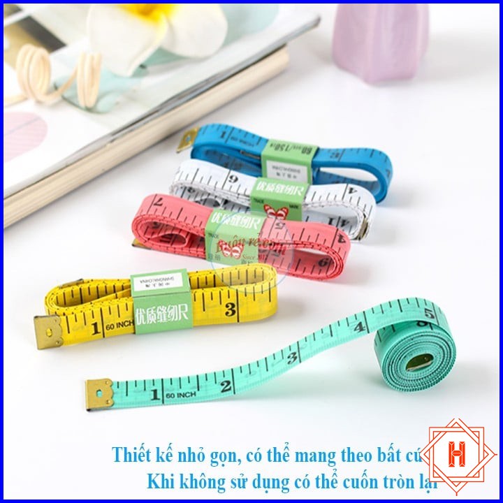 - Thước dây bản nhỏ đo lường 1,5m khá tiện lợi, trên thước chia vạch kích thước rõ ràng giúp bạn đo nhanh và chính xác các vật dụng chiều dài tương ứng.