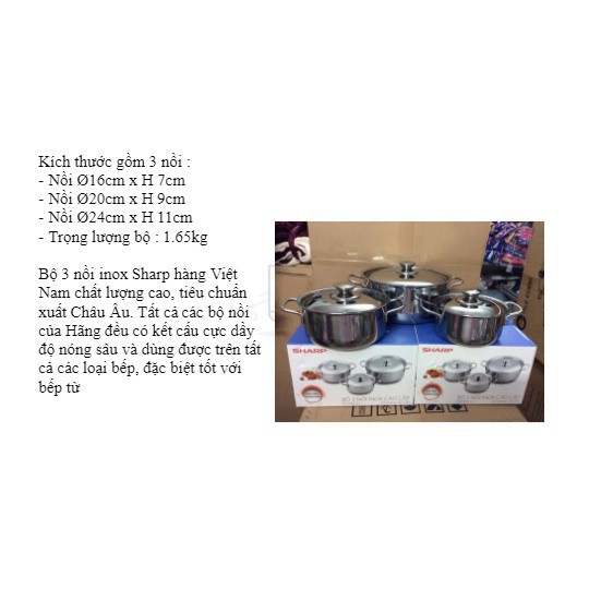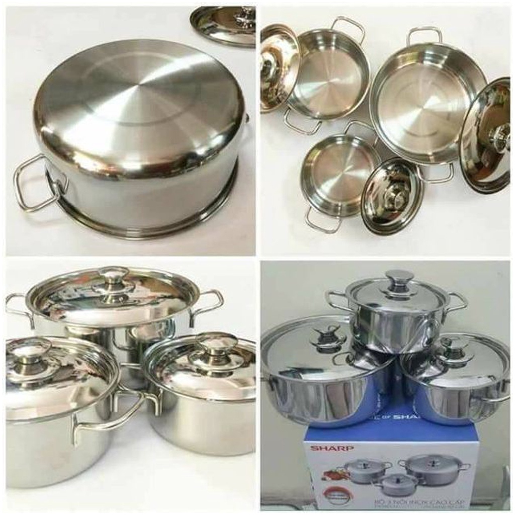 Bộ Nồi Inox Cao Cấp Gồm 3 Nồi - Bộ Nồi INOX Sharp Chống Gỉ Sét* Bộ ba nồi inox sharp có thể sử dụng lâu dài an toàn cho sức khoẻ, thu nhiệt nhanh, toả nhiệt đều giúp đun nấu nhanh, tiết kiệm nhiên liệu, duy trì độ sáng bóng một cách lâu bền và luôn đẹp như mới.