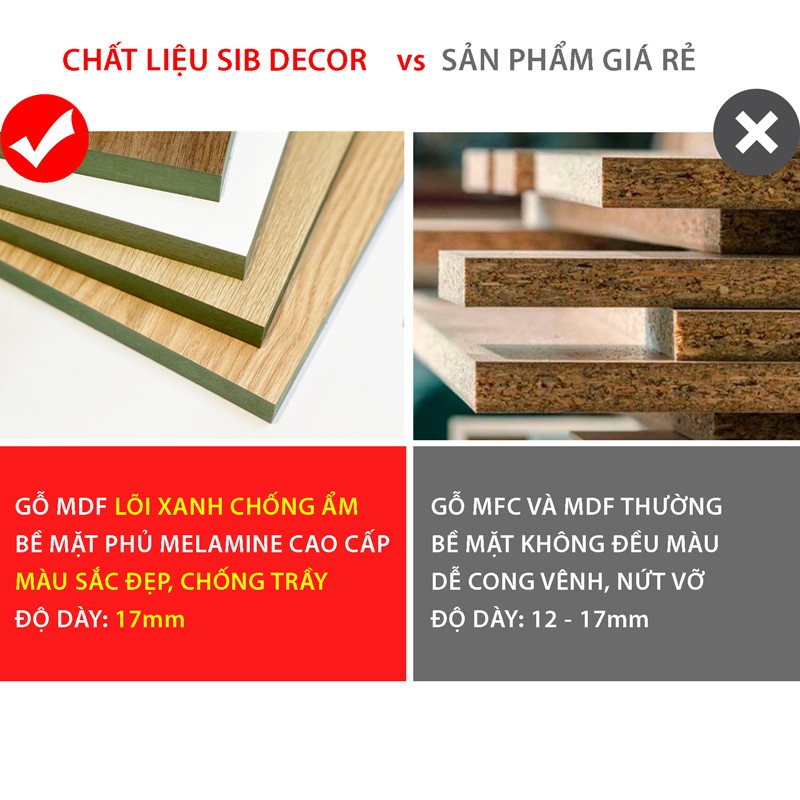 - Chất liệu: Gỗ HMR (MDF lõi xanh kháng ẩm) phủ melamine, chống cong vênh, mối mọt. Bề mặt chống trầy, kháng nước, dễ dàng vệ sinh.