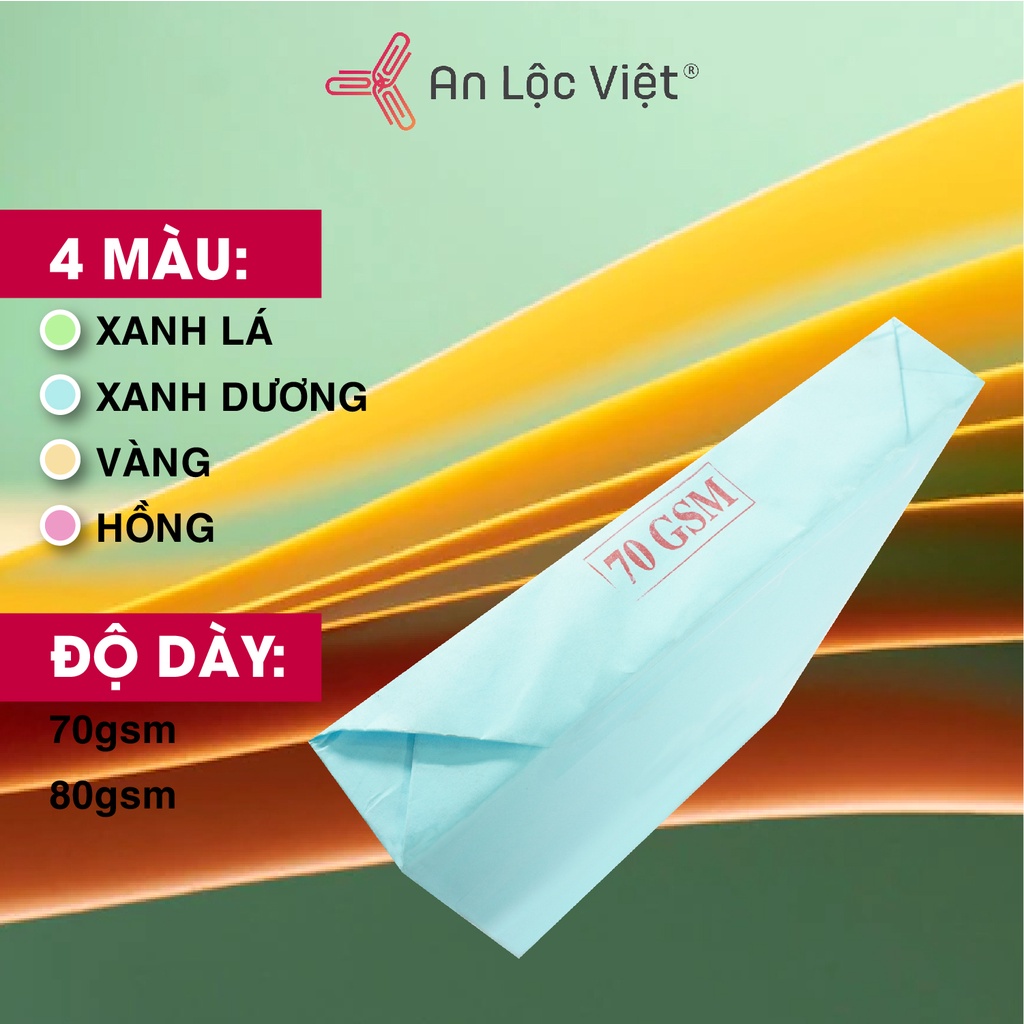 - Kích thước khổ A4, định lượng giấy 70gsm hoặc 80gsm, giấy có các màu: xanh lá, xanh dương, hồng, vàng