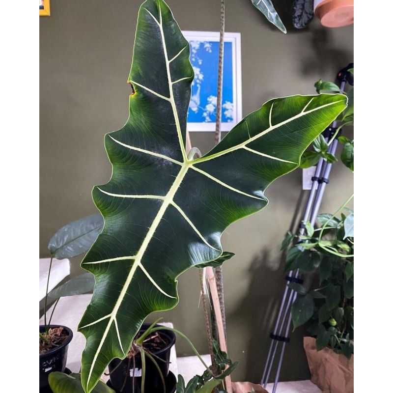 Cây alocasia Sarian nổi bật với lá lớn, thon dài tựa như chiếc đầu rồng. Cây có màu xanh lam nổi bật, gân lá màu trắng tinh nổi bần bật trên nền láCây trưởng thành có thể cao từ 1,2m - 1,5 m