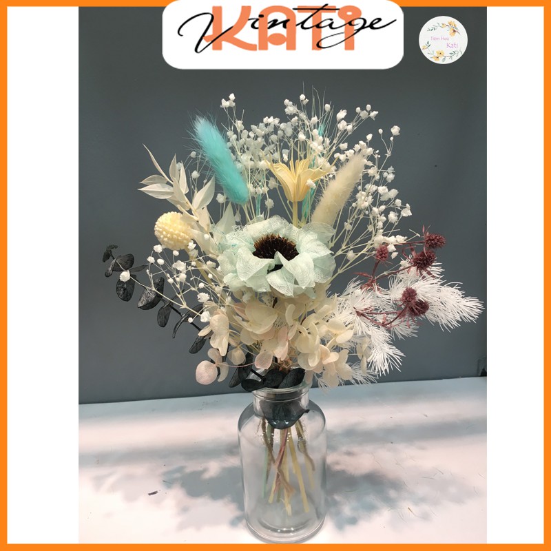 Chiều cao bình thủy tinh15cm, hoa20-25cm