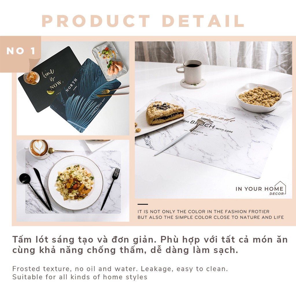 - Những tấm lót trang, sáng tạo và đơn giản. Phù hợp với tất cả món ăn. Khả năng chống thấm, dễ dàng làm sạch, phù hợp với mọi không gian bàn ăn