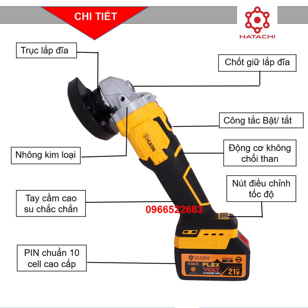 Máy Mài Dùng Pin HUKAN👉Máy mài góc HUKAN ZX3 PRO dùng pin lithium-ion để hoạt động, model này có khả năng mài/cắt kim loại mạnh mẽ không hề thua kèm các máy dùng điện, mài nhẵn, tuổi thọ cao. Phần tay cầm gọn, ôm trọn lòng bàn tay mang lại cảm giác thoải mái khi sử dụng trong 1 thời gian dài, lớp vỏ của máy được làm từ nhựa cao cấp, có thể chịu lực tốt, nếu chẳng may làm rơi máy xuống đất thì cũng chẳng sao.