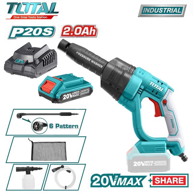 Máy xịt rửa xe áp lực cao dùng pin Lithium-ion (20V 2.0A/h) Total TPWLI20084► Kèm 1 pin 20V 2.0A/h + 1 đế sạc
