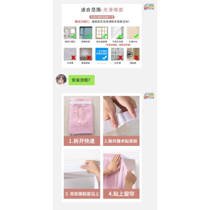 Rèm cửa dán siêu tiện lợi không cần khoan tường hay khung.Rèm có 2 lớp: lớp vải và lớp voan trắng, rèm dày, che sáng tốt, dễ tháo ra giặt giũ.