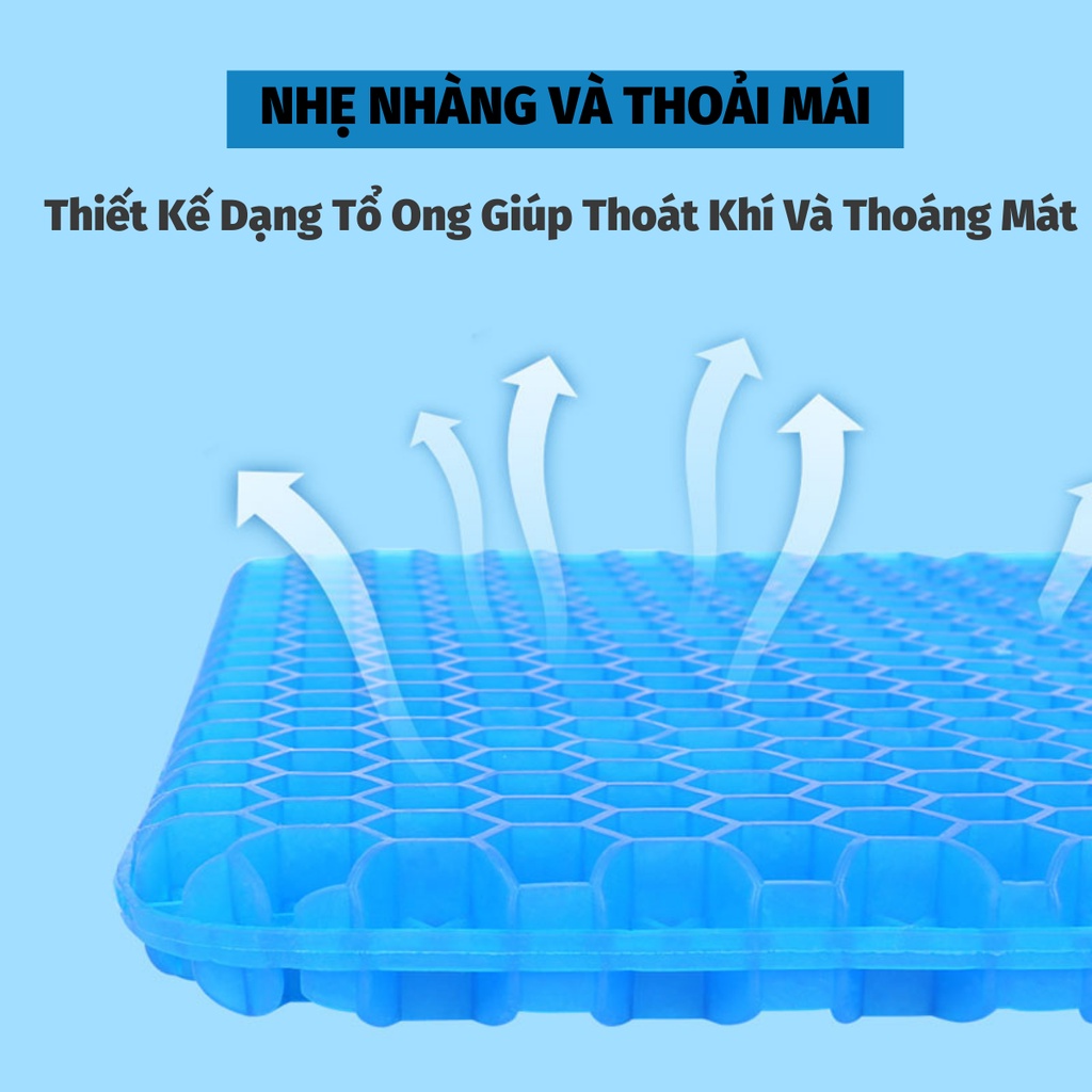- Thiết kế tổ ong thoát khí trong toàn bộ đệm, giữ mát, ngăn ngừa mồ hôi Chống thâm mông do mồ hôi - Chống mụn nhọt và chống bệnh trĩ do phải ngồi nhiều.