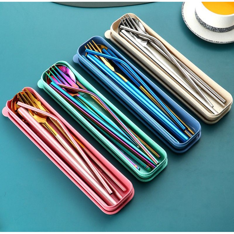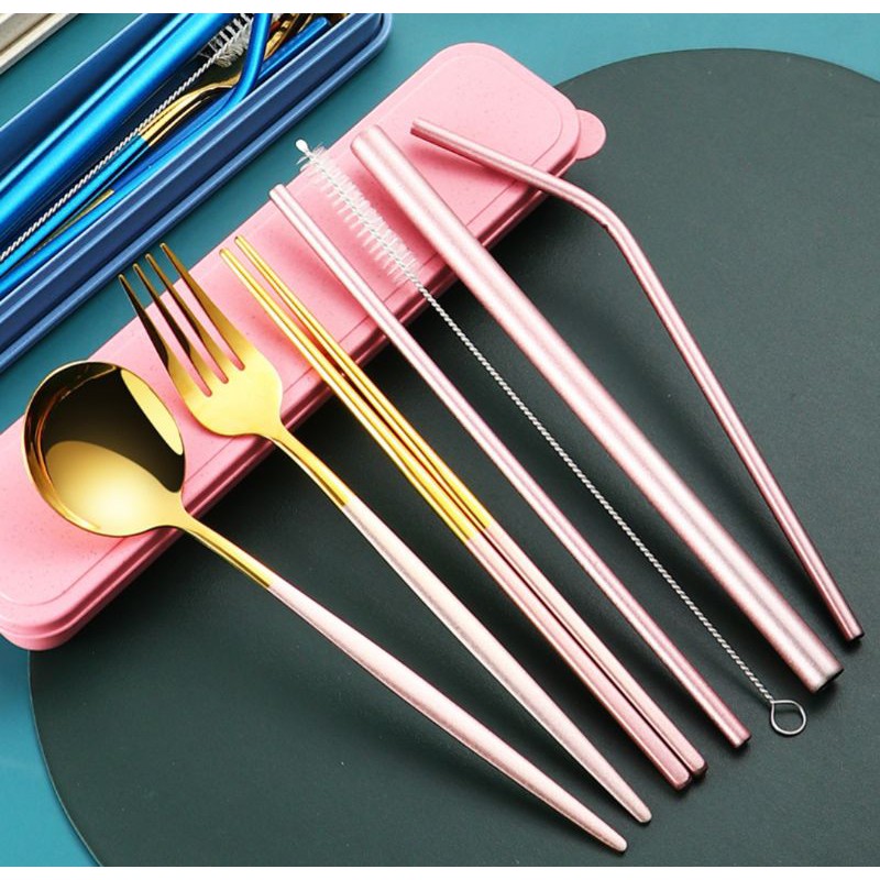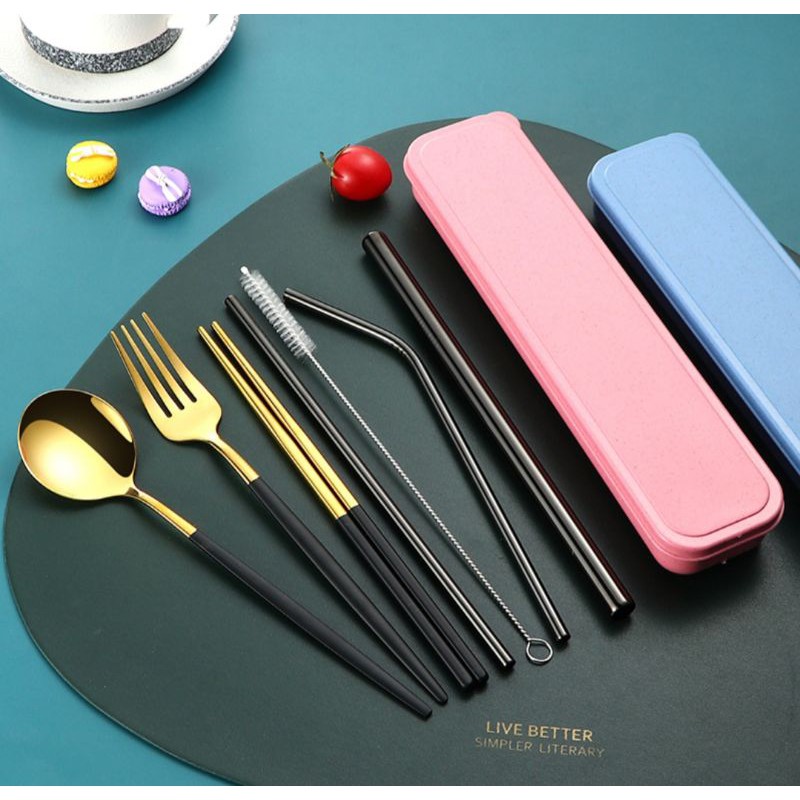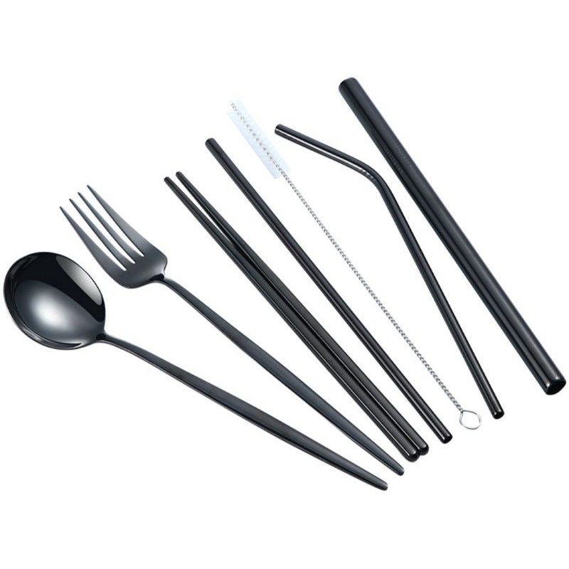 Set 7 món muỗng đũa nĩa ống hút bằng thép không gỉ 304 cao cấp