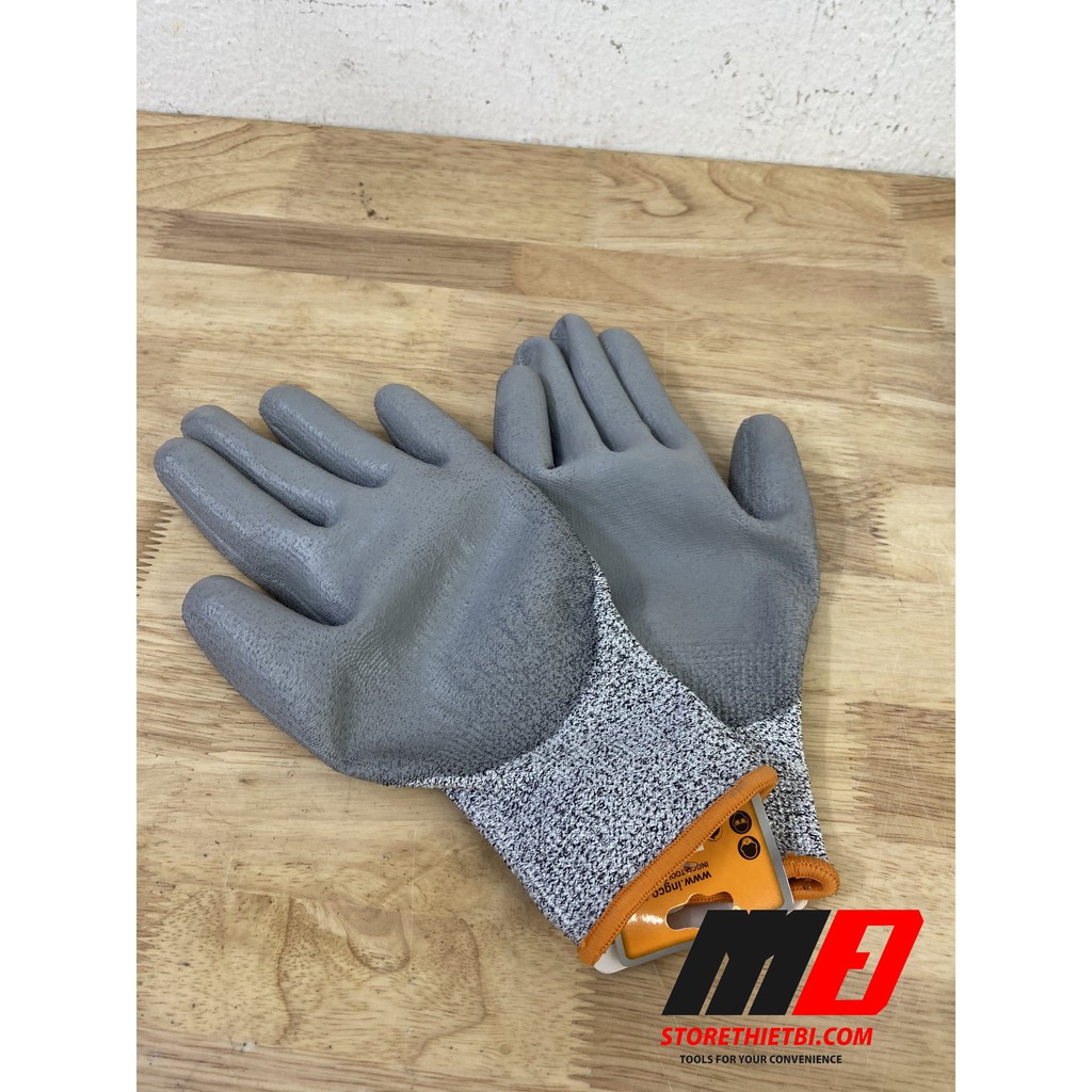 -Găng tay được làm bằng chất liệu cao su tổng hợp, được tráng một lớp PU trên bề mặt của găng tay giúp bảo vệ tay khỏi bị bỏng hay bị vật sắc bén đâm vào.