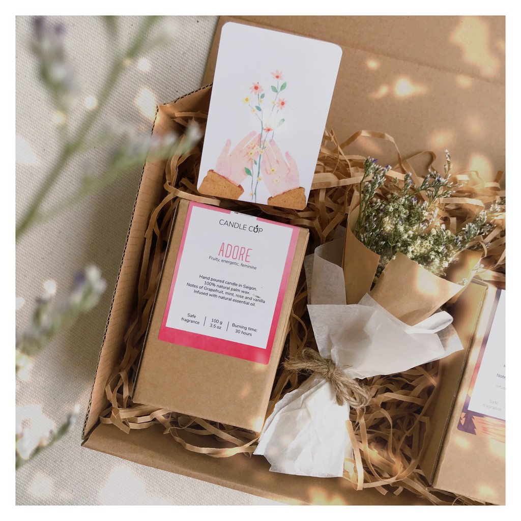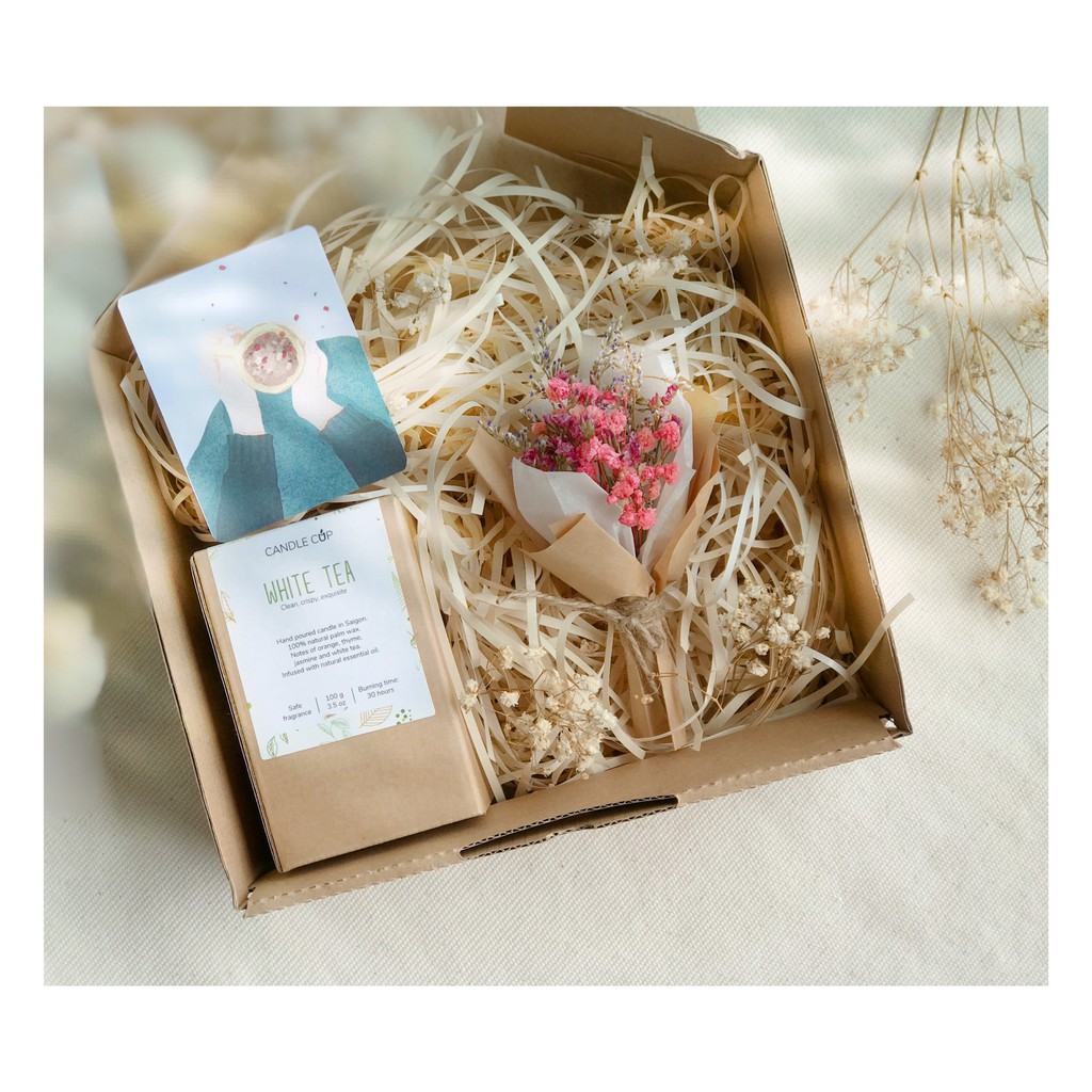 🌻Set quà 1: gồm 01 nến (hương tự chọn) + 01 hoa + thiệp + hộp giấy nhãn có thiết kế đồng bộ với thiệp