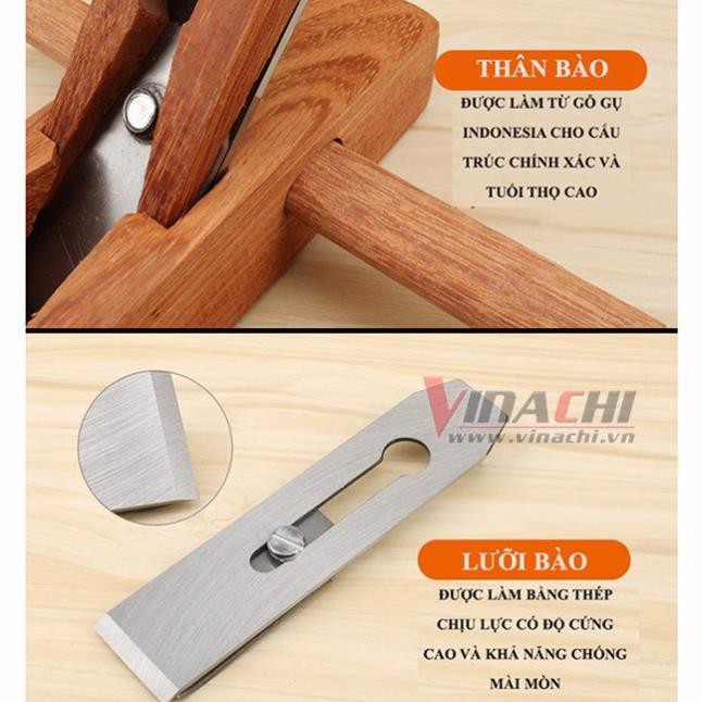 - Thân bào được làm từ gỗ dụ có khả năng tránh cong vênh và mang lại độ bền cao cho sản phẩm, bên cạnh đó miệng bào mini được làm bằng đồng có khả năng chống bào mòn khi sử dụng lâu. Đặc biệt lưỡi bào được làm bằng thép 2 lớp: thép - hợp kim và một chiếc lưỡi úp.