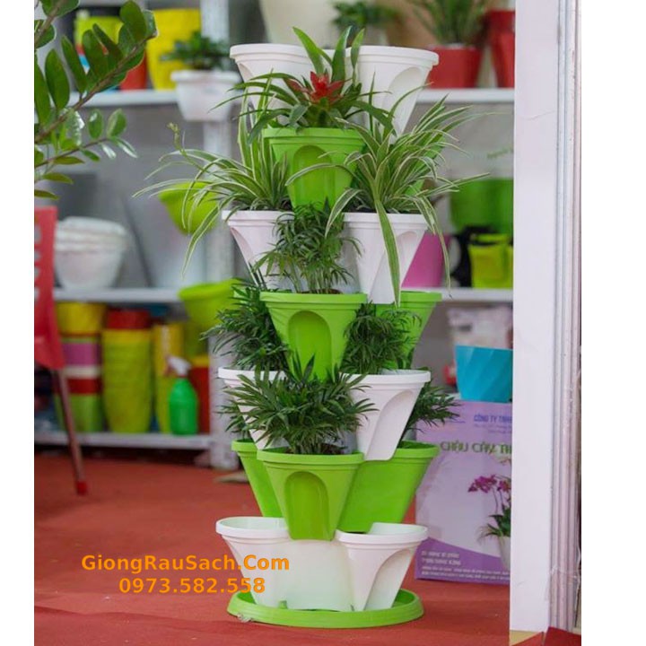 Tháp trồng rau hữu cơ tiện lợi, tiện ích cho mỗi gian đình có không gian hẹp, Tháp rau gọn nhẹ trồng đủ các loại rau ăn lá, dâu tây, hành hoa, cây gia vị, dịch chuyển thay đổi khoảng cách, tầng cao đẻ phù hợp với các cách trồng.Mỗi tầng trồng được 3 hốc cậy xung quanh