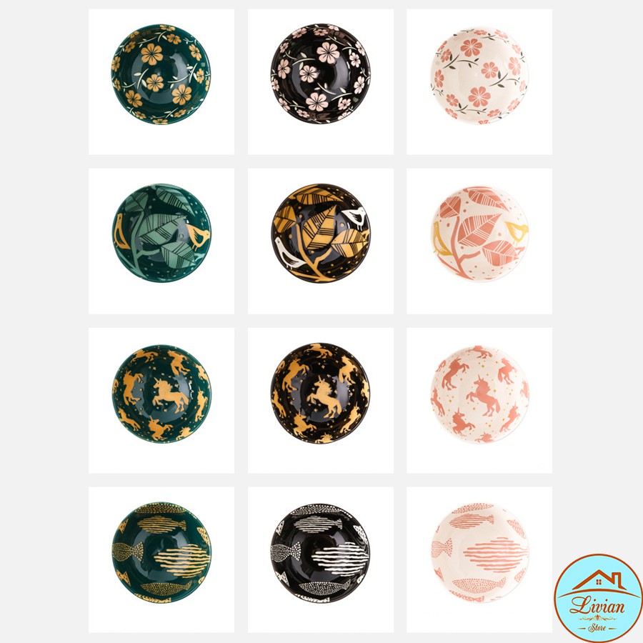 Bát ăn cơm, bát ăn dặm bằng sứ có vân chống trơn họa tiết hoa lá, ngựa và cá cực xinh