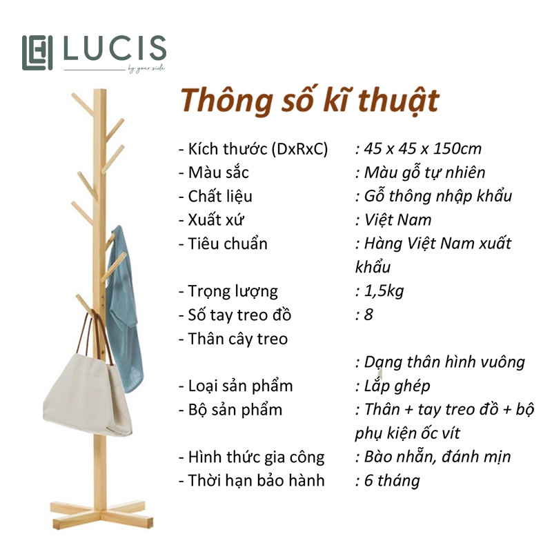 Giới thiệu Cây treo quần áo gỗ thân vuông LUCIS treo đồ phòng ngủ