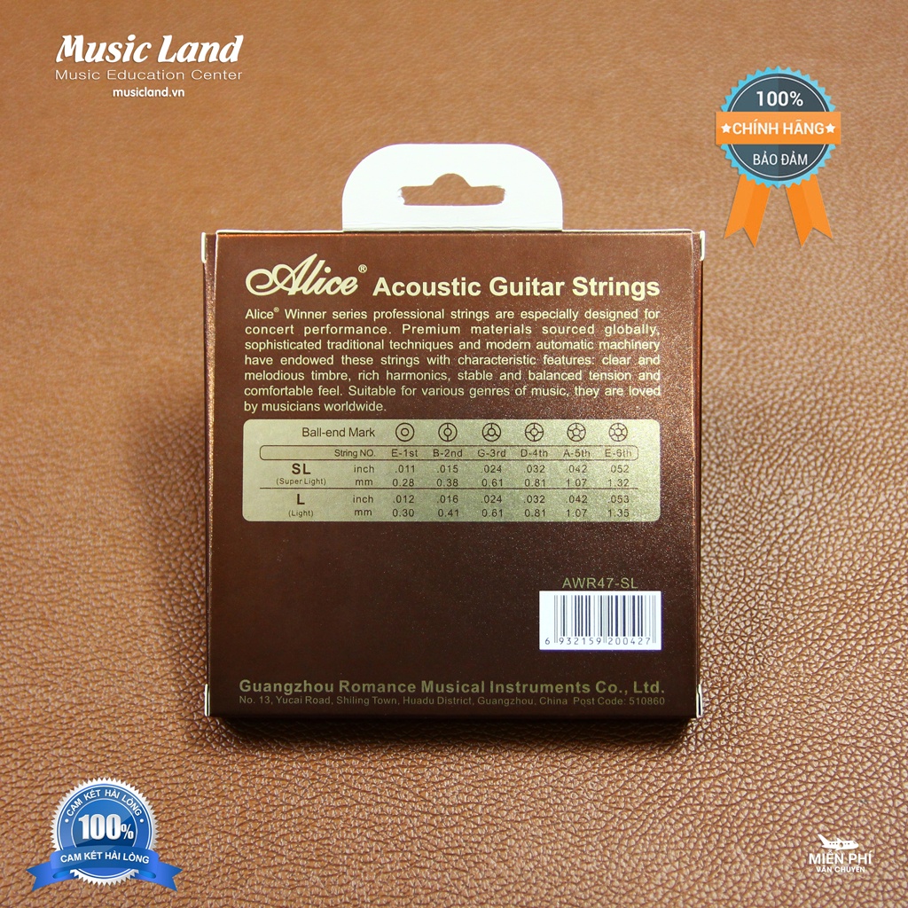 - Dây đàn Guitar Acoustic Alice AWR47 được sản xuất bằng công nghệ cao của hãng Alice bọc đồng và phốt pho, có độ dẻo dai, sức bền cao. Dây có trọng lượng phù hợp đảm bảo tương thích với dòng guitar acoustic. Sản phẩm cho tiếng đàn vang và hay, âm thanh rõ, sạch, trong trẻo.