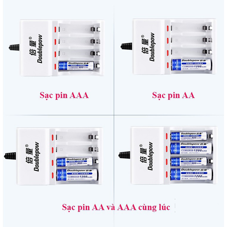 Bộ sạc có thể sạc các pin thông dụng: AA, AAA, NiHM/NiCd. Với khả năng sạc được cùng lúc từ 1 đến 4 pin các loại AA hoặc AAA, bộ sạc pin Doublepow sẽ giúp bạn nạp năng lượng cho pin một cách nhanh chóng, tiện lợi.