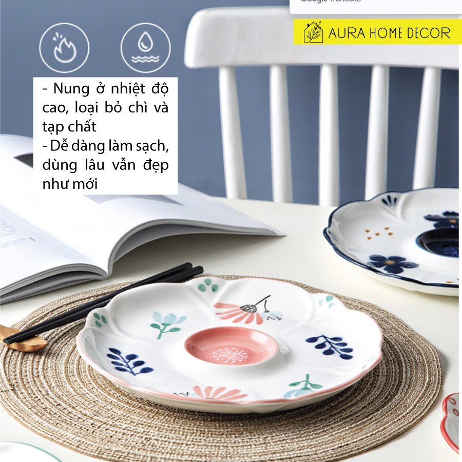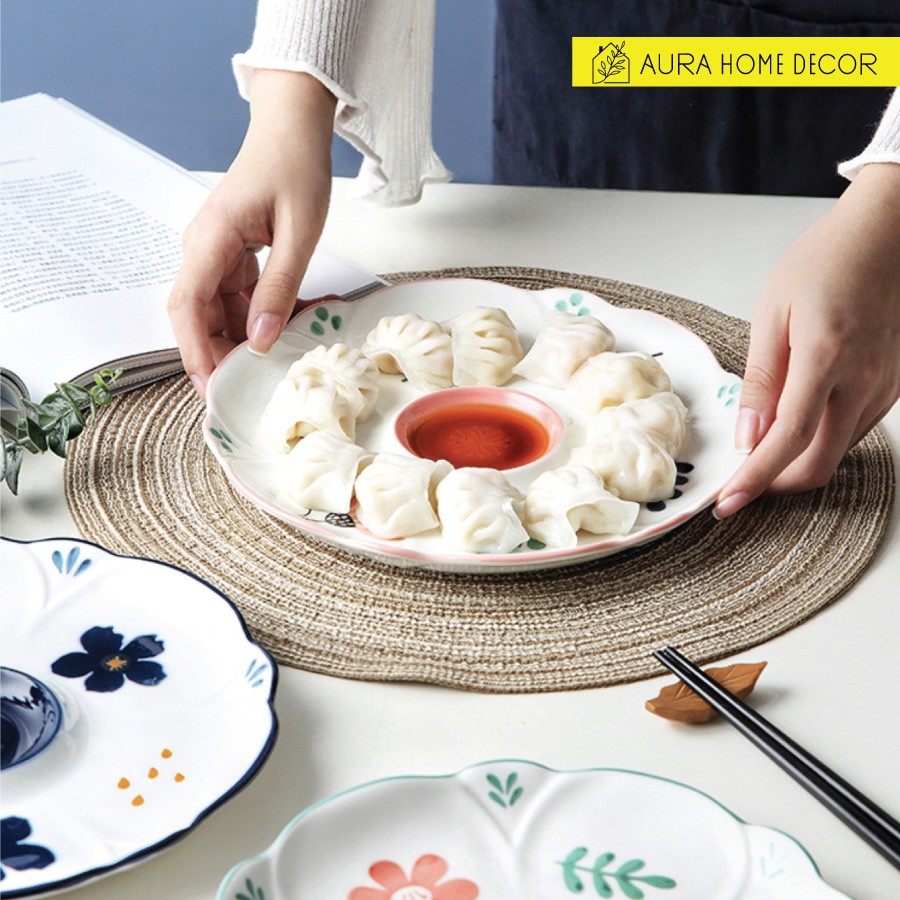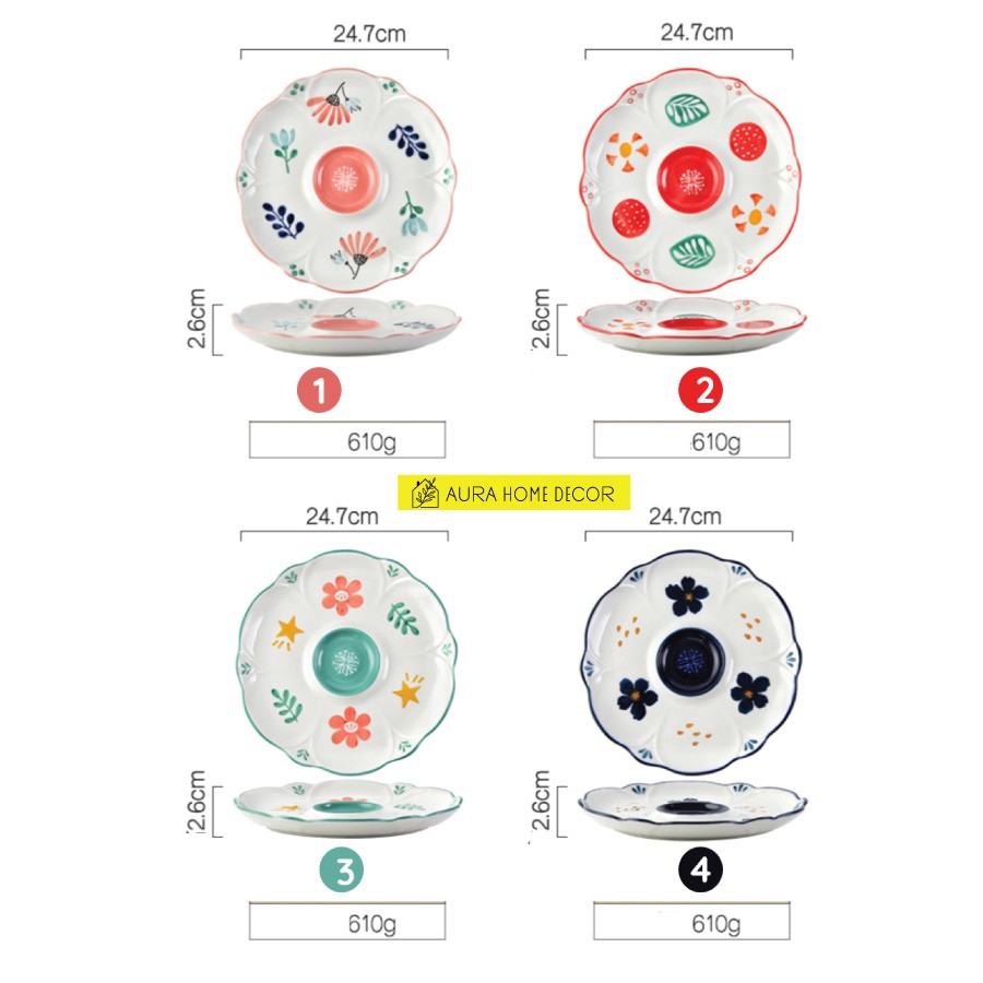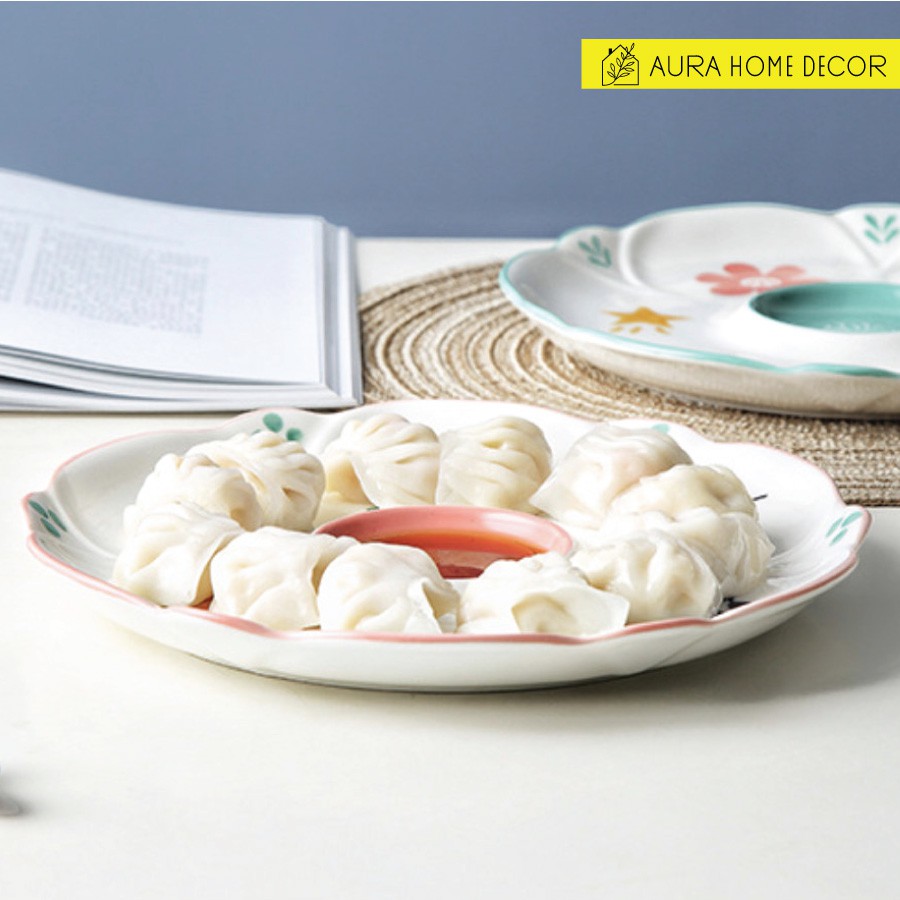 Đĩa chia ô hình hoa cực xinh có ngăn đựng tương ớt, tương cà, nước mắmNhà AURA có sẵn 4 màu cho chúng mình lựa chọn, đk 24.7cm, sâu 2.6cm, thoải mái sử dụng tromg lò nướng, lò vi sóng, máy rửa bát.