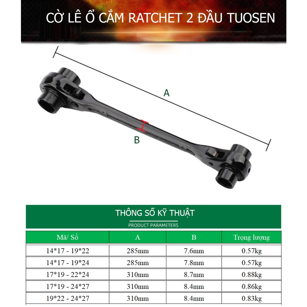 Cờ lê ổ cắm Ratchet 2 đầu TUOSEN, cờ lê bánh cóc - với 5 lựa chọn từ cỡ 14mm tới 27mm