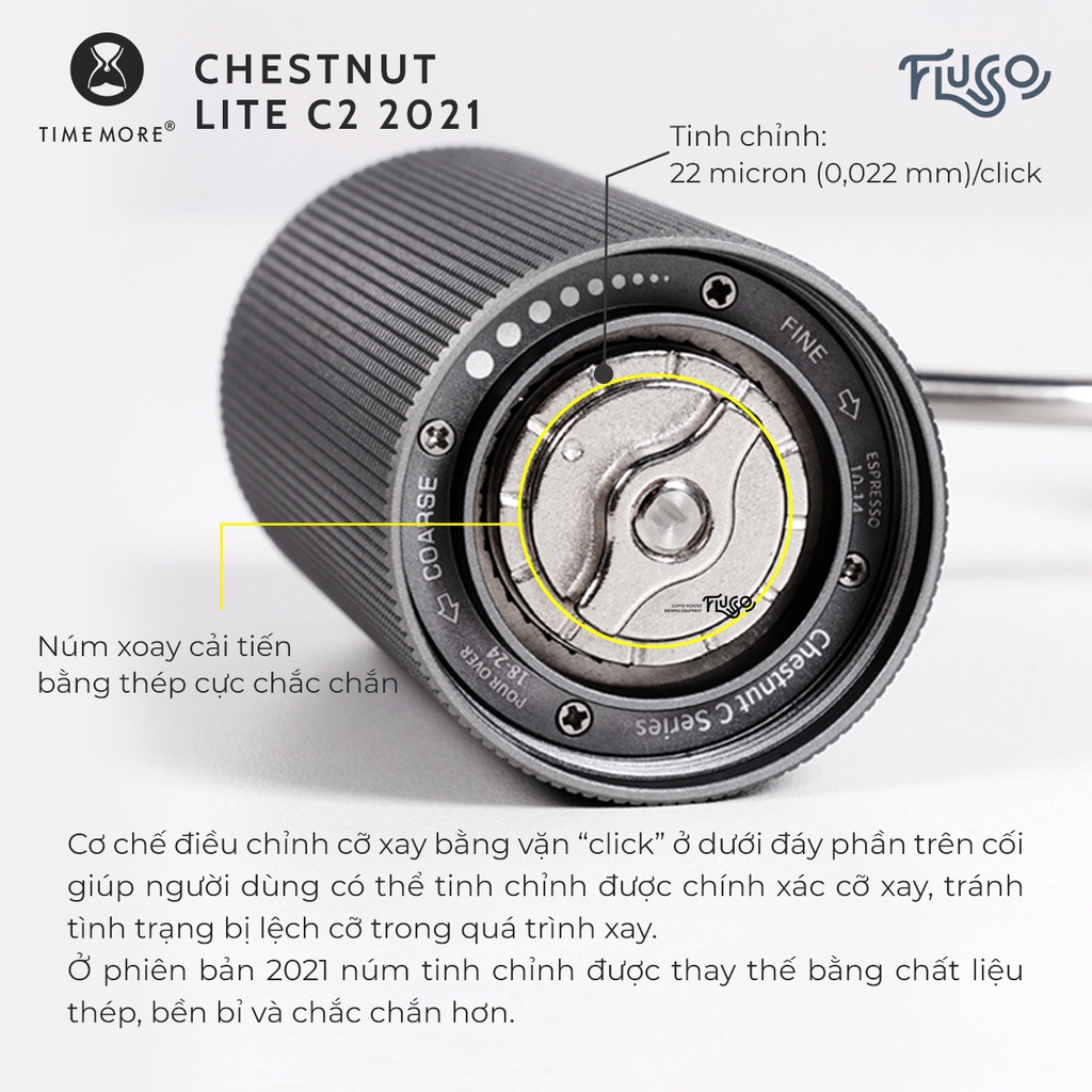 Bản cập nhật 2021 mới nhất của Cối xay Timemore C2 được thay đổi bộ phận tinh chỉnh cỡ xay từ chất liệu đồng và nhựa sang thép, bền bỉ và chắc chắn hơn.