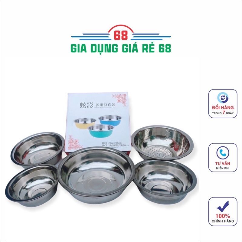 Bộ Thau Rổ Inox 5 món Cao Cấp Cho Nhà BếpSét Rổ Inox 5 Món Tiện Dụng