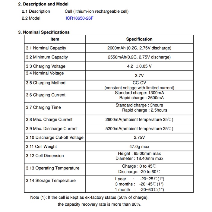 Tiêu chuẩn sạc và xả: hơn 1000 lần, sạc cắt điện áp 4.2V, xả điện áp cắt 2.5V.