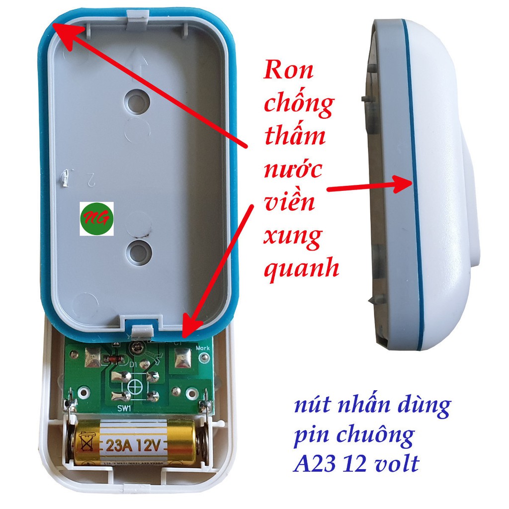 - Nút nhấn: dùng Pin 12V-23A, thiết kế độ kín nước theo tiêu chuẩn quốc tế IP44, với ron kín nước viền xung quanh, đây cũng là ƯU ĐIỂM của Chuông cửa không dây có nút nhấn chống nước Kawasan-DB668B so với các loại chuông khác, đáp ứng được nhu cầu của các ngôi nhà cần gắn nút nhấn ở các vị trí không được che kín, chống nước mưa tạt vào.