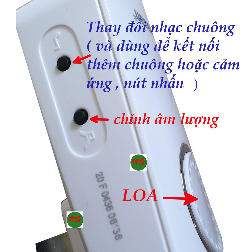 - Đầu chuông cắm vào ổ điện 220V, chỉnh được 32 kiểu chuông, âm lượng 50-80dB, có thể chỉnh âm lượng lớn nhỏ tùy theo nhu cầu với 4 cấp âm lượng.