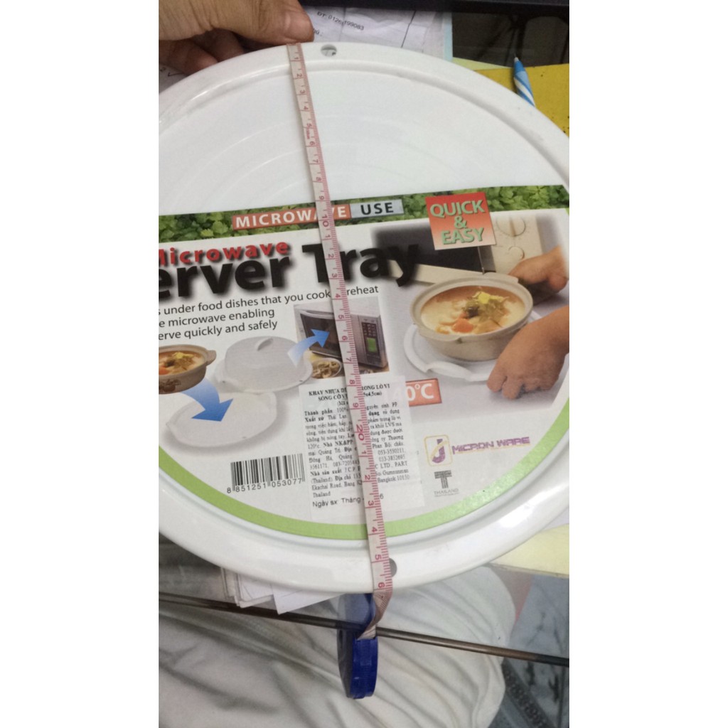 - Khay nhựa lò vi sóng. Khay nhựa tròn. Đường kính ngoài gồm tay cầm là 28cm, chiều cao 4,5cm. Trọng lượng 150g.