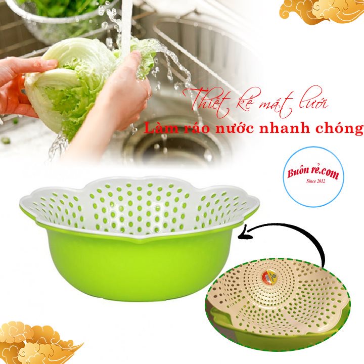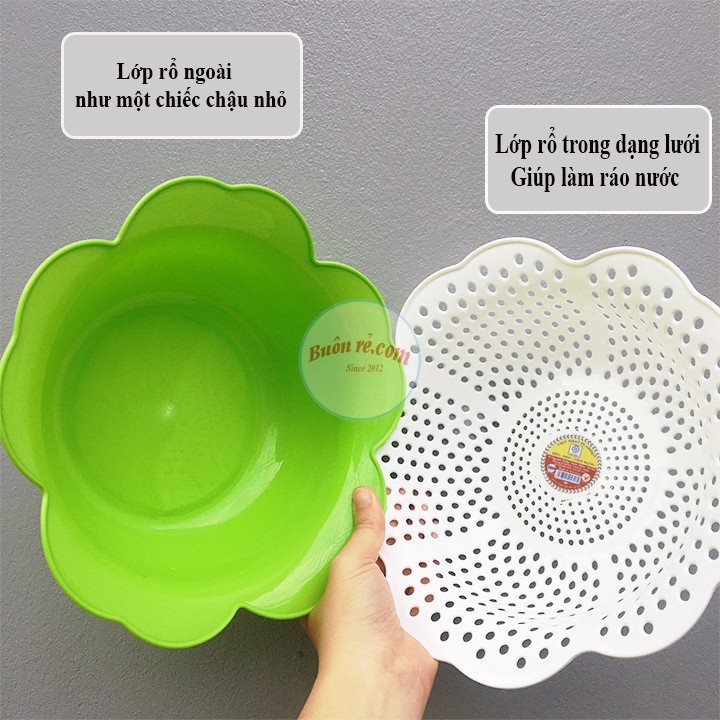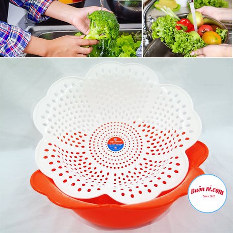 - Thiết kế thông minh 2 in 1 với lớp trong rổ thiết kế dạng mắt lưới giúp làm ráo nước, lớp bên ngoài thiết kế nhưa một chiếc chậu nhỏ giúp hứng nước từ rổ bên trong.