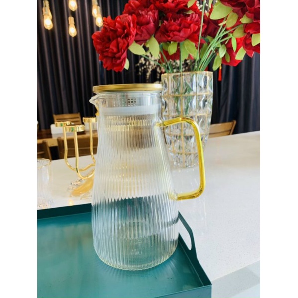 Bình sử dụng chất liệu thủy tinh sáng bóng, tuyệt đối an toàn khi sử dụng. Chất liệu thủy tinh dễ chùi rửa, không gây ám mùi thực phẩm như chất liệu nhựa. Việc vệ sinh chiếc bình sẽ trở nên dễ dàng và nhanh chóng hơn, bảo đảm an toàn vệ sinh, tiện lợi trong việc lựa chọn và sử dụng. Miệng bình tinh xảo, quai màu vàng không dễ mẻ, nứt, bền theo thời gian.