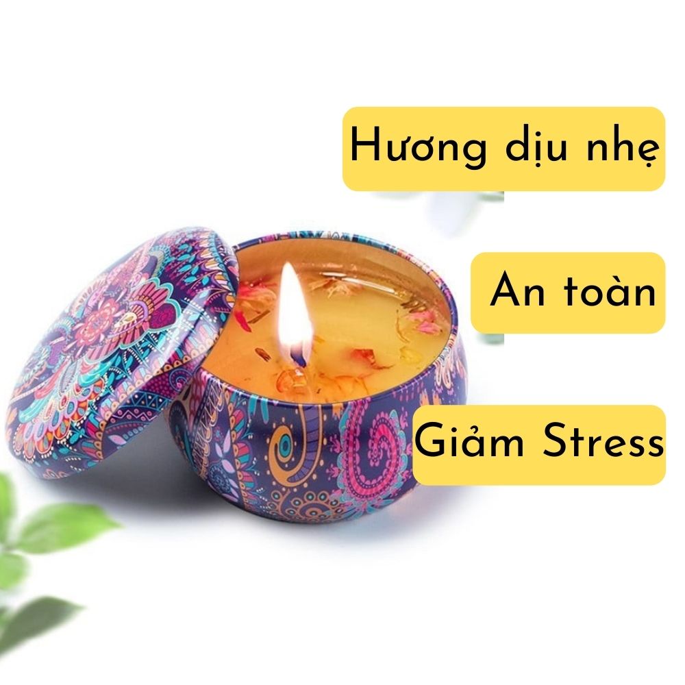 - Nến thơm có vỏ hộp làm từ thiếc trang trí bắt mắt, sang trọng